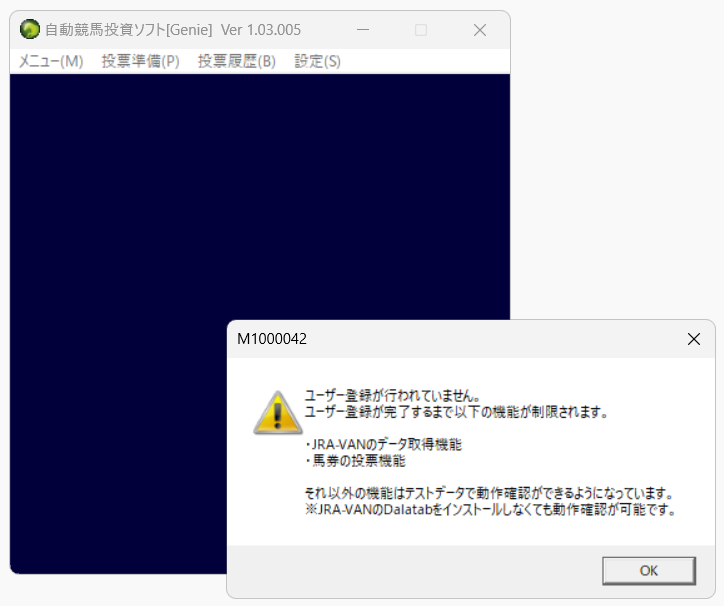 ・JRA-VANのデータ取得機能・馬券の投票機能それ以外の機能はテストデータで動作確認ができるようになっています。※JRA-VANのDalatabをインストールしなくても動作確認が可能です。